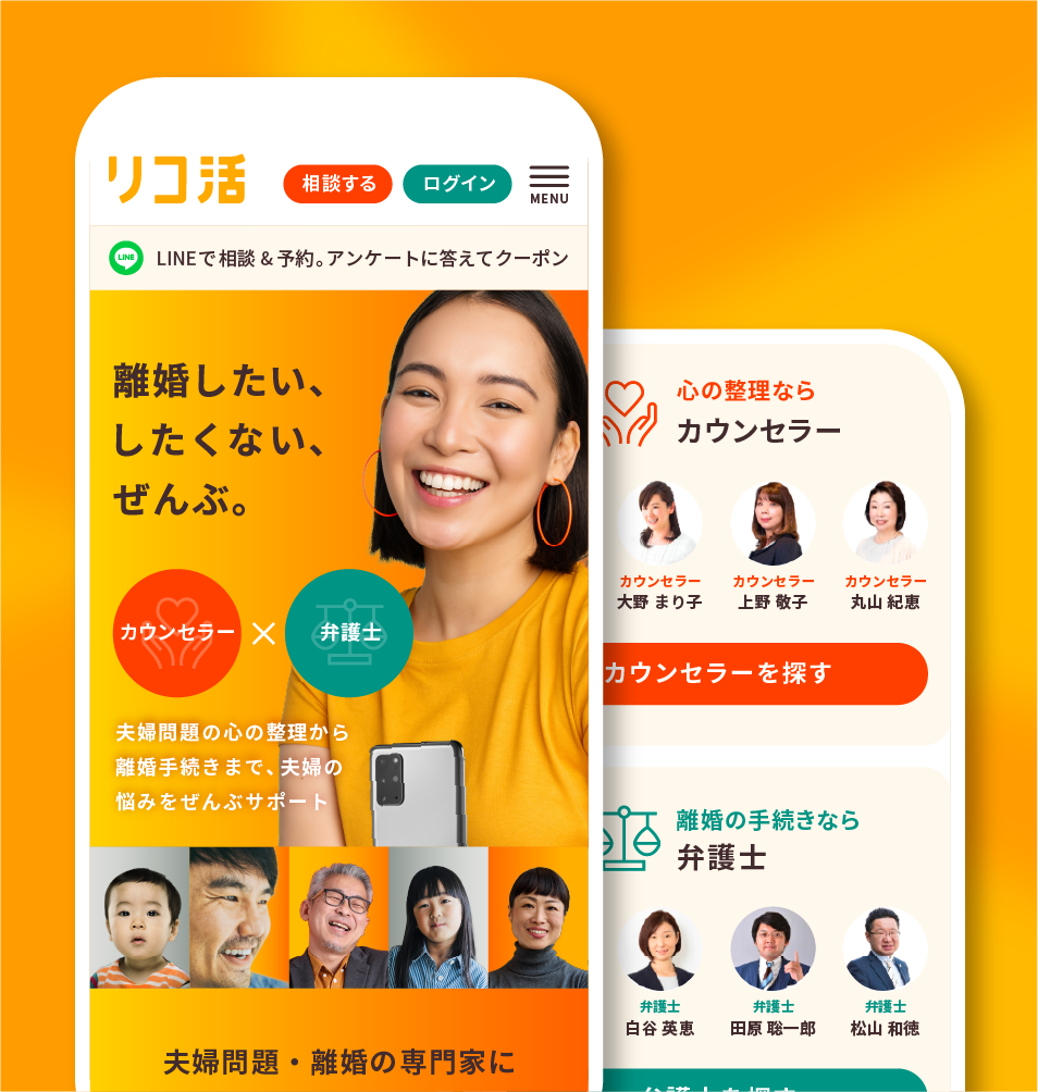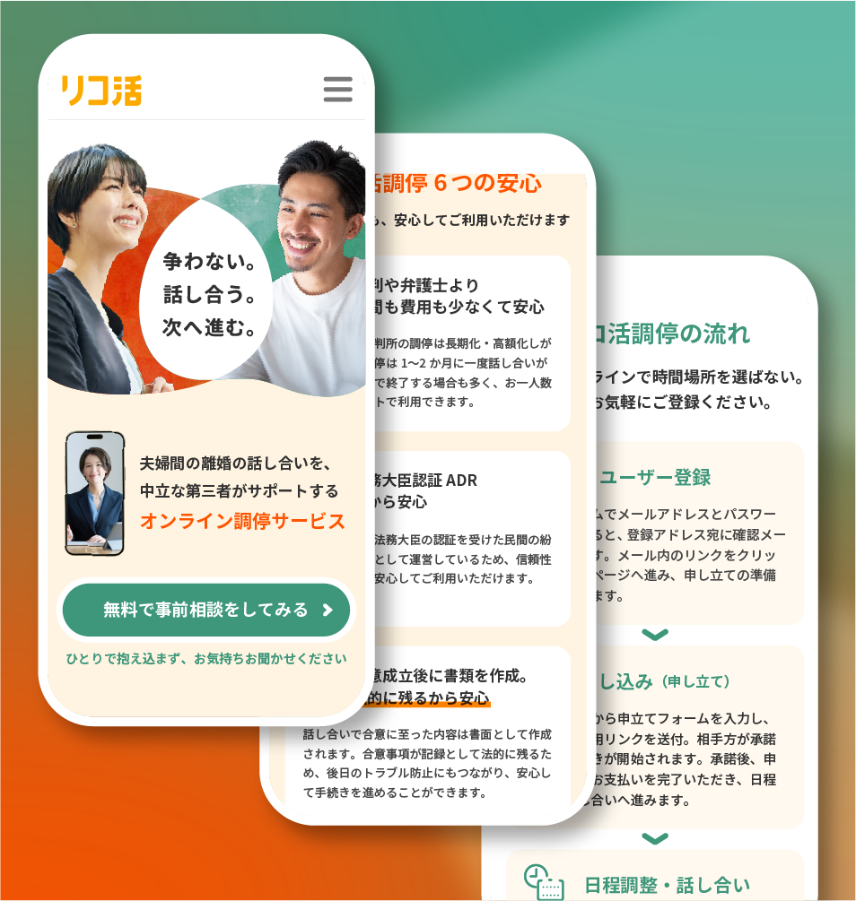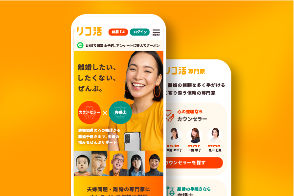 すべては、幸せに向かう再出発のために。 すべては、幸せに向かう再出発のために。 NEWS お知らせ 2025.01.08 ニュース 法務省よりADR認証を取得しました 2023.12.15 ニュース ホームページを公開しました。 一覧を見る MISSION 事業理念 すベては、幸せに向かう再出発のために。 多様化する社会。多様化する生き方。友人、パートナー、家族。人との関係にも新しいカタチが生まれている。そして、新しい悩みも生まれている。私達は、人とテクノロジーの力で、悩みに寄り添い、新しい生き方を提案、実現に向けたサポートをしたい。そう想いを込めて、Re Lifeと名付けました。すべては、幸せに向かう再出発のために。 OUR WORKS 事業紹介 リコ活 離婚したい、したくない、 ぜんぶ。 夫婦問題や離婚で悩むすべての人に、 体験談や最新の情報、実績のある専門家とのマッチングでワンストップで提供するサービス。 詳しく見る お問い合わせ リコ活メディア 離婚、夫婦問題・修復の役立つ専門家監修の情報サイト リアルな悩みに即した体験談から解決策の提示まで。弁護士やカウンセラーの監修記事により最新の、信頼できる情報を提供。 詳しく見る お問い合わせ リコ活調停 争わない。話し合う。次へ進む。 夫婦間の離婚の話し合いを、法務省認定調停機関の中立な第三者、調停人がサポートするオンライン調停サービス 詳しく見る お問い合わせ リコ活への登録をご希望する弁護士、カウンセラーの皆様 リコ活との提携をご希望される事業者様 お問い合わせ CONTENTS 特集記事 COMPANY 会社概要 会社名 株式会社リライフテクノロジー 設立 2022年 4月 15日 資本金 1億1870万円 (資本準備金含む) 所在地 東京都千代田区丸の内三丁目3番1号 新東京ビル1階 連絡先 contact@relife-technology.co.jp 代表者 小林 弘典 事業内容 離婚、夫婦問題・修復の課題解決型マッチングメディア「リコ活」の開発、運営 法律顧問 Authense法律事務所 リコ活への登録をご希望する弁護士、カウンセラーの皆様 リコ活との提携をご希望される事業者様 その他各種お問い合わせ お問い合わせ